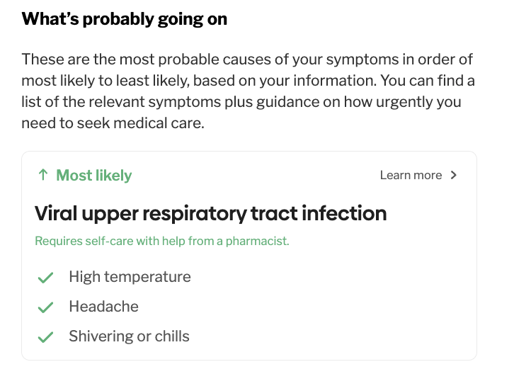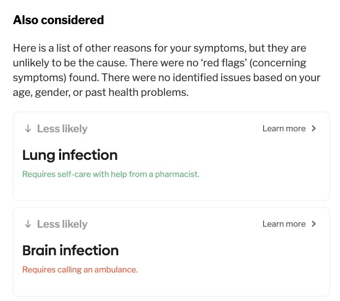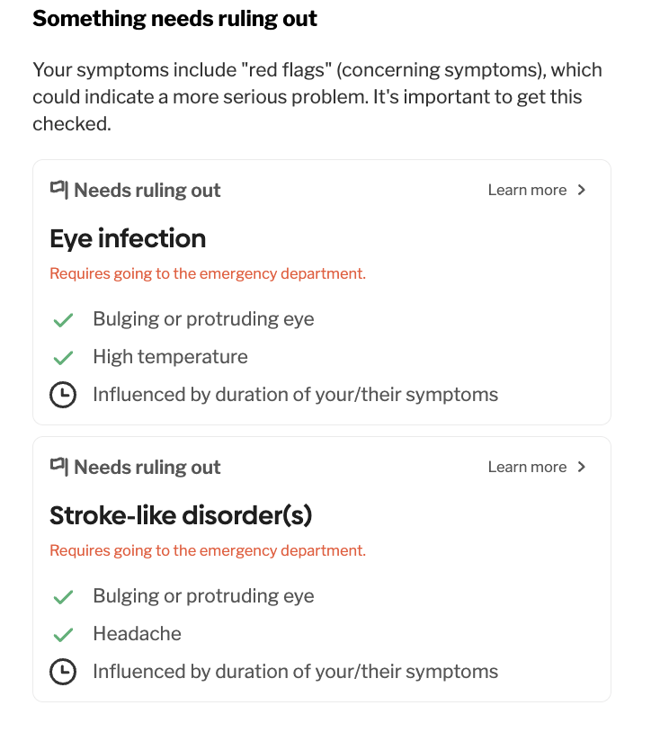 to_rule_out- conditions the system is unsure about, but reported due to red flags combination of symptoms in user input, a matter of medical safety.likely- conditions the system deemed likely given the user input.also_considered- conditions the system deemed less likely given the user input.