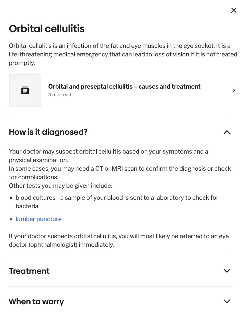 In addition, the article.content.triage object is returned, which contains short form information in markdown format about the condition. The object will contain one, two or three of the following properties: triage_diagnostic, triage_treatment and triage_worries.